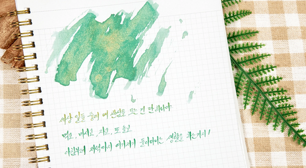 Ink that captures the mischievous and curious nature of Pinocchio, a bundle of energy and a troublemaker. With a vibrant base in emerald and mint colors, subtle yellow undertones emerge, complemented by the sparkling gold glitter that adds a lively touch to the ink.