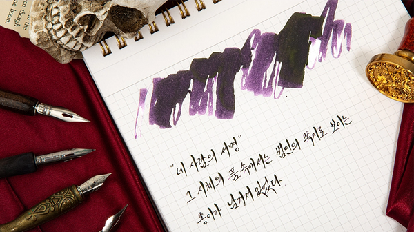 Inspired by "The Sign of Four", this ink features four distinct colors coexisting in a single bottle. The base color is purple, overlaid with a green sheen, while blue and gold glitter maintain their brilliance with distinct presence.