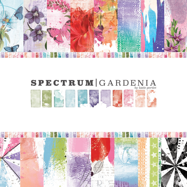 The Spectrum Gardenia collection, designed by Katie Pertiet for 49 and Market, is a reminder of beautiful rainbows. At its core are eight heavy-weight (100 lb.) double-sided papers in vibrant blends of pinks, oranges, blues, greens, purples with a pop of black which packs a punch for contrast. This collection imagery includes florals, foliage, butterflies, scripty text and splashes in all the pretty colors.