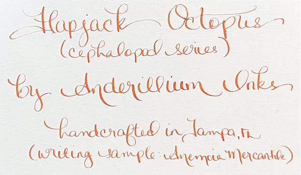 La pieuvre Flapjack est votre nouvelle créature marine préférée. Les Flapjacks vivent au fond de l'océan où ils errent probablement comme mon robot aspirateur, à la recherche de quelque chose de comestible dans le sable. Si vous commencez à chercher des photos d'une pieuvre flapjack, vous vous rendrez compte que tout ce qui se trouve au fond de l'océan n'est pas effrayant ou laid, et vous perdrez une heure de votre temps car vous continuerez à chercher d'autres photos d'elles. . Le poulpe flapjack n'est décidément pas le kraken, sans doute pas très bon à manger avec du sirop d'érable au petit déjeuner, mais absolument une couleur incontournable pour votre stylo plume. Procurez-vous une bouteille de Flapjack Orange Octopus et chaque fois que vous écrivez, vous vous souviendrez du petit mollusque le plus mignon de la mer.