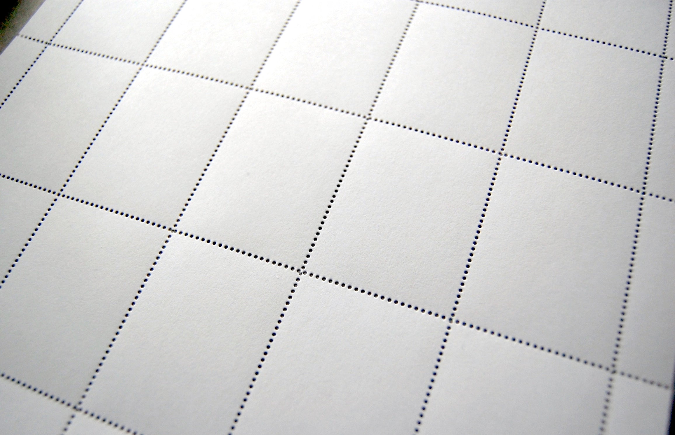 Make your own poster stamps. These Lick & Stick stamp sheets are pinhole perforated using a vintage perforating machine, with moisture-activated gum on the back.