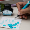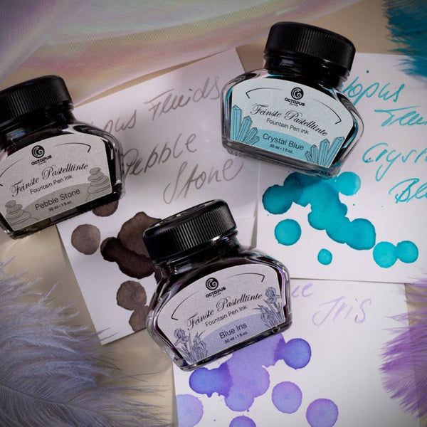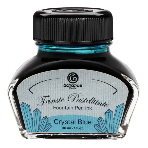 Finest Pastel Blue Fountain Pen Ink for Calligraphy, Fountain Pens and Nibs Crystal Blue - our fountain pen ink in soft pastel blue. Light, fresh colors which differ significantly from conventional writing inks due to their transparency. From the Dresden-based company Octopus Fluids GmbH & Co. KG.
