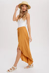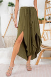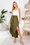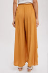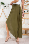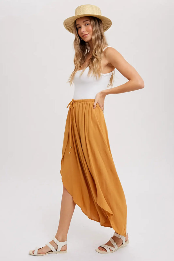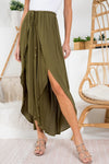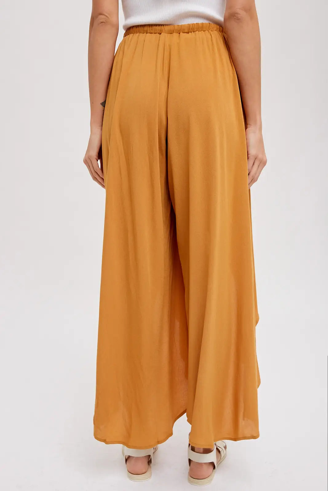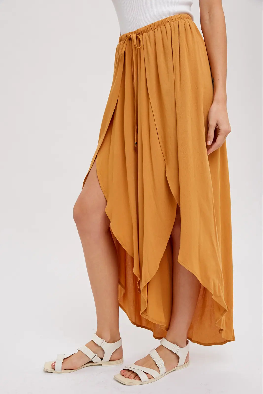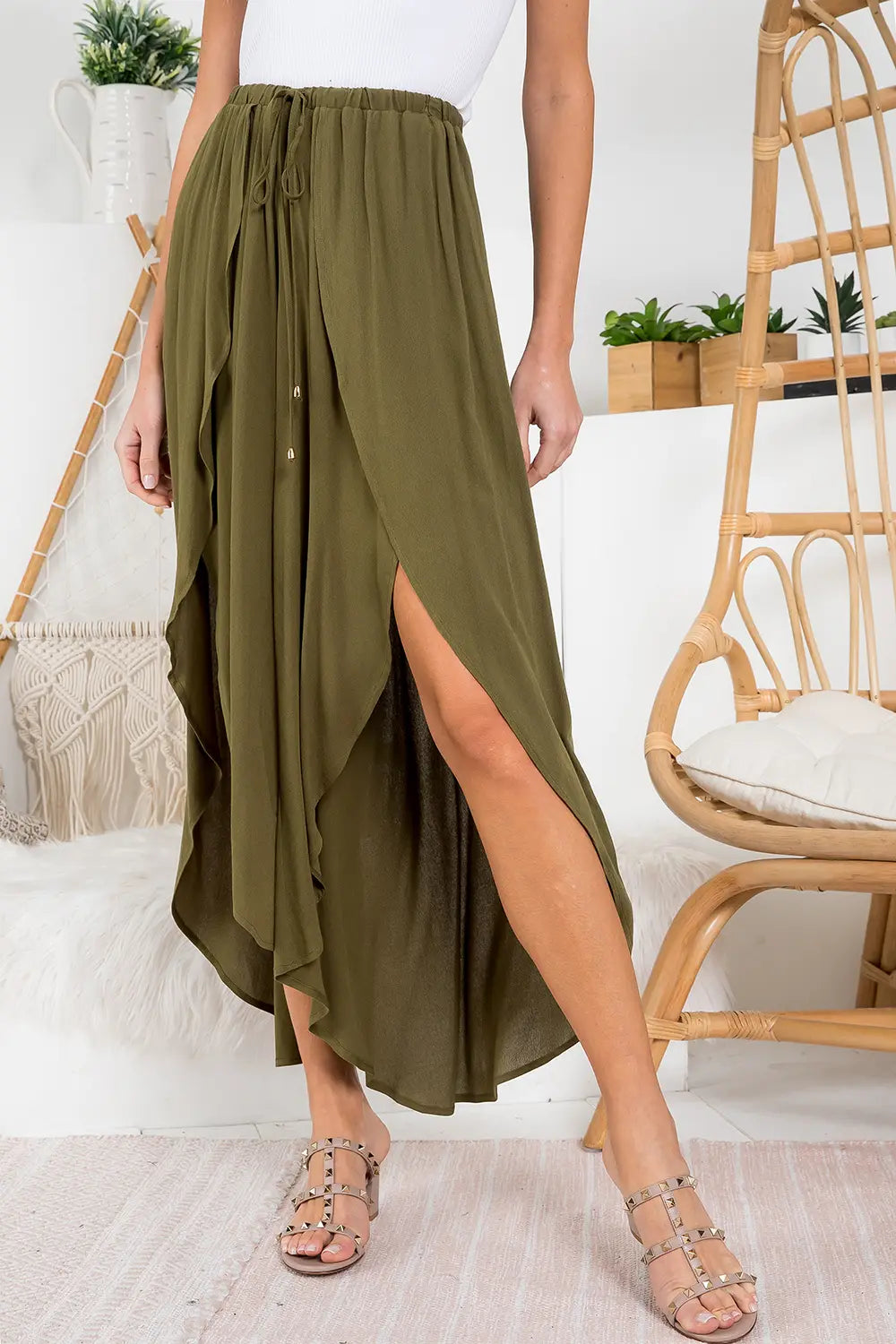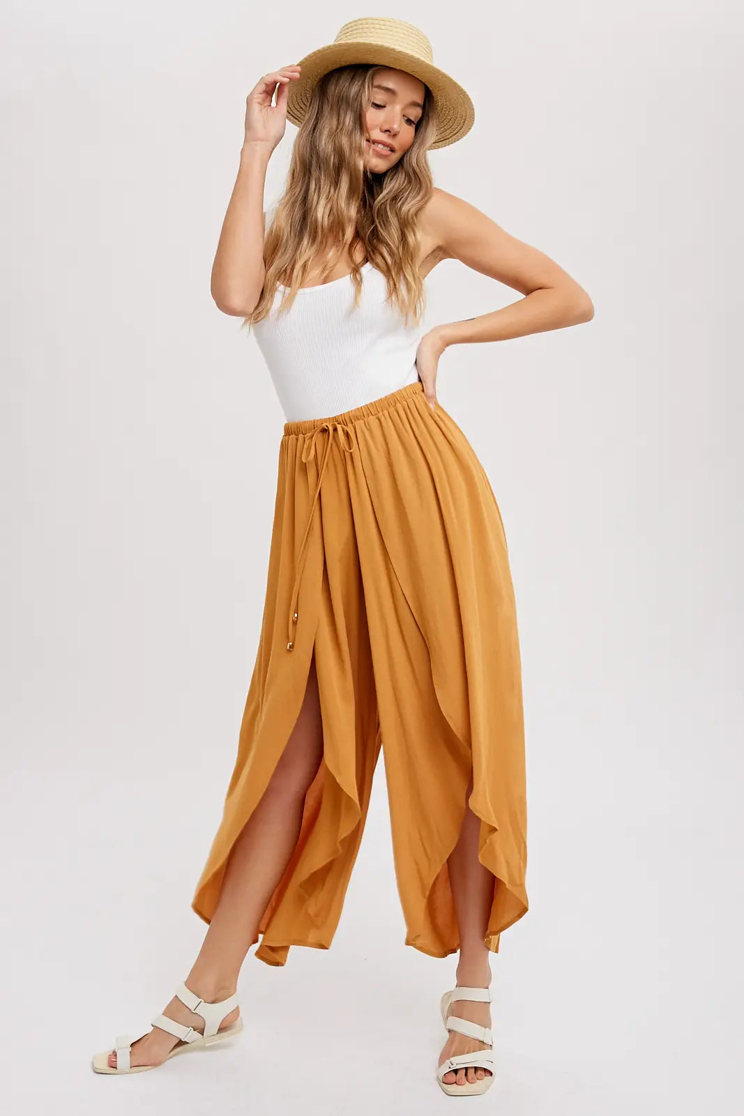 Easy and breezy wrap culottes features an elastic waist with adjustable drawstring, wide leg opening with high slits, relaxed fit.