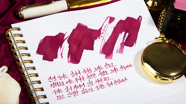 The Young King ink features a vibrant magenta-red base with subtle coppery-red glitter, symbolizing the hidden lives of common people beneath royal opulence. The rose-gold shimmer adds a touch of elegance, shifting to yellow or silver tones depending on the angle.